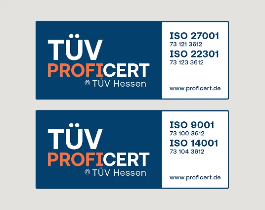 Unsere zertifizierten Managementsysteme nach ISO 9001 (Qualitätsmanagement), ISO 27001 (Informationssicherheitsmanagement), ISO 22301 (Business Continuity Management) sowie ISO 14001 (Umweltmanagement) spiegeln unseren hohen Anspruch an Qualität, Sicherheit und Nachhaltigkeit wider und gewährleisten, dass wir unseren Kunden jederzeit zuverlässige und verantwortungsbewusste Dienstleistungen auf höchstem Niveau bieten.